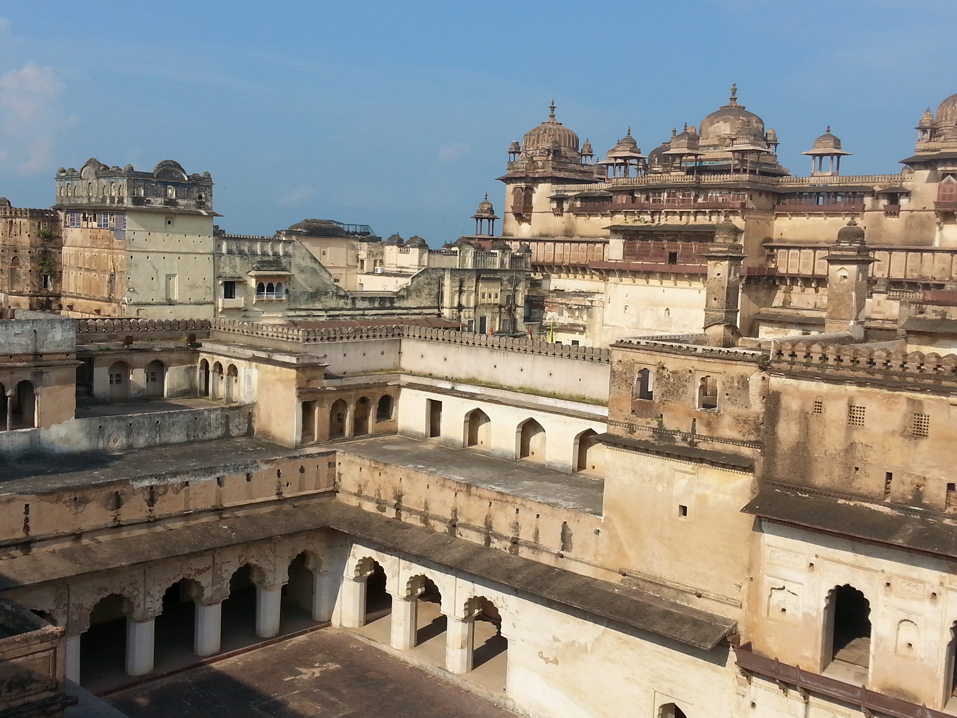 The palace in Orccha was stunning, and I probably preferred it to the Taj Mahal, if only because we were allowed to wander around and climb to the very top and see everything in all directions. The portion that has since been made into a hotel by the Madhya Pradesh tourism board kind of interfered with the view, but their chai was damn good, so I guess that is OK. And the Chaturbhuj temple across the river was fantastic. After getting bindi from the priest, the caretaker noticed us (I think, specifically, noticed us giving too much to the priest, as I was out of small bills), and led us through a locked door and up a flight of stairs and another and another and these stairs: they are quite tall, and quite steep. A dog named Julie also followed along, and snuck into a few of the photos that the caretaker insisted on taking of us at every place where there was a nice view (there were tens of these) all the while (the caretaker, not the dog) saying “Fantaaastic, fantaaaaastic!” And, as little as I enjoy getting my photo taken, it was that.