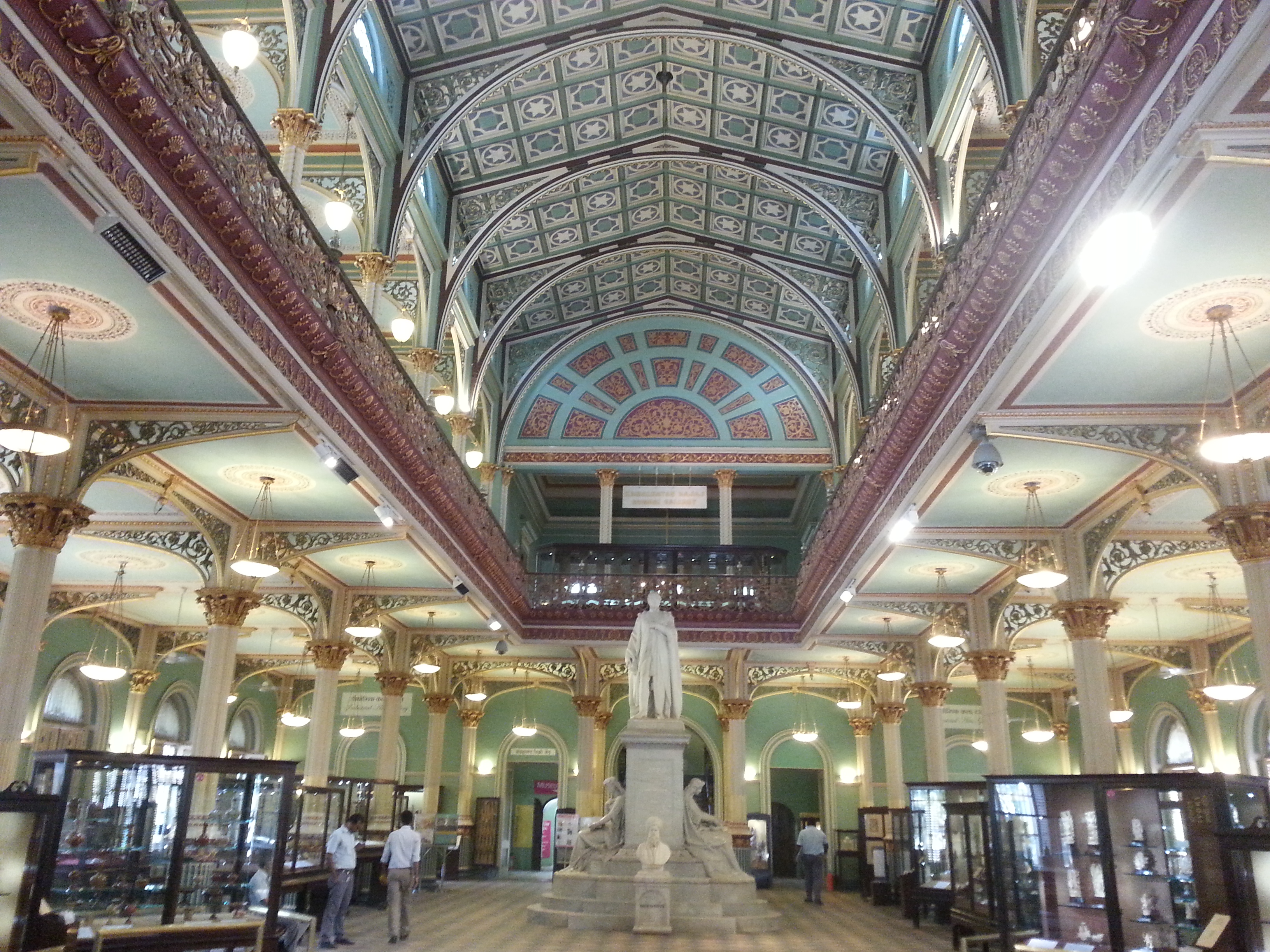 The Dr. BDL Museum was much smaller, and in an interesting location; an hours drive north of me, the main entrance was closed and under construction, so signs told me to walk about a kilometer around and through a zoo. The entrance fee was definitely worth it at 5 Rs, or about 8 cents, but it did seem like a kind of sad zoo, with a few deers and monkeys visible in the far back of their habitats, which did not seem terribly well maintained or invested in. And when I got to the museum itself, the same construction was still being done and I walked over the road as they were currently setting paving stones in place. Inside, there was a magnificent collection of, I guess, “craftwork.” although the delicate carvings, paintings and pottery on display within seemed like they were more than deserving of the title “art.” These were all displayed in old varnished wood cabinets with glass siding, some of the information cards clearly typewritten not long after the the opening of the museum in 1857.The building itself was beautiful, with light turquoise walls and gold decorations, arches and tiles everywhere, and it was just one large room, with everything visible from the second floor.