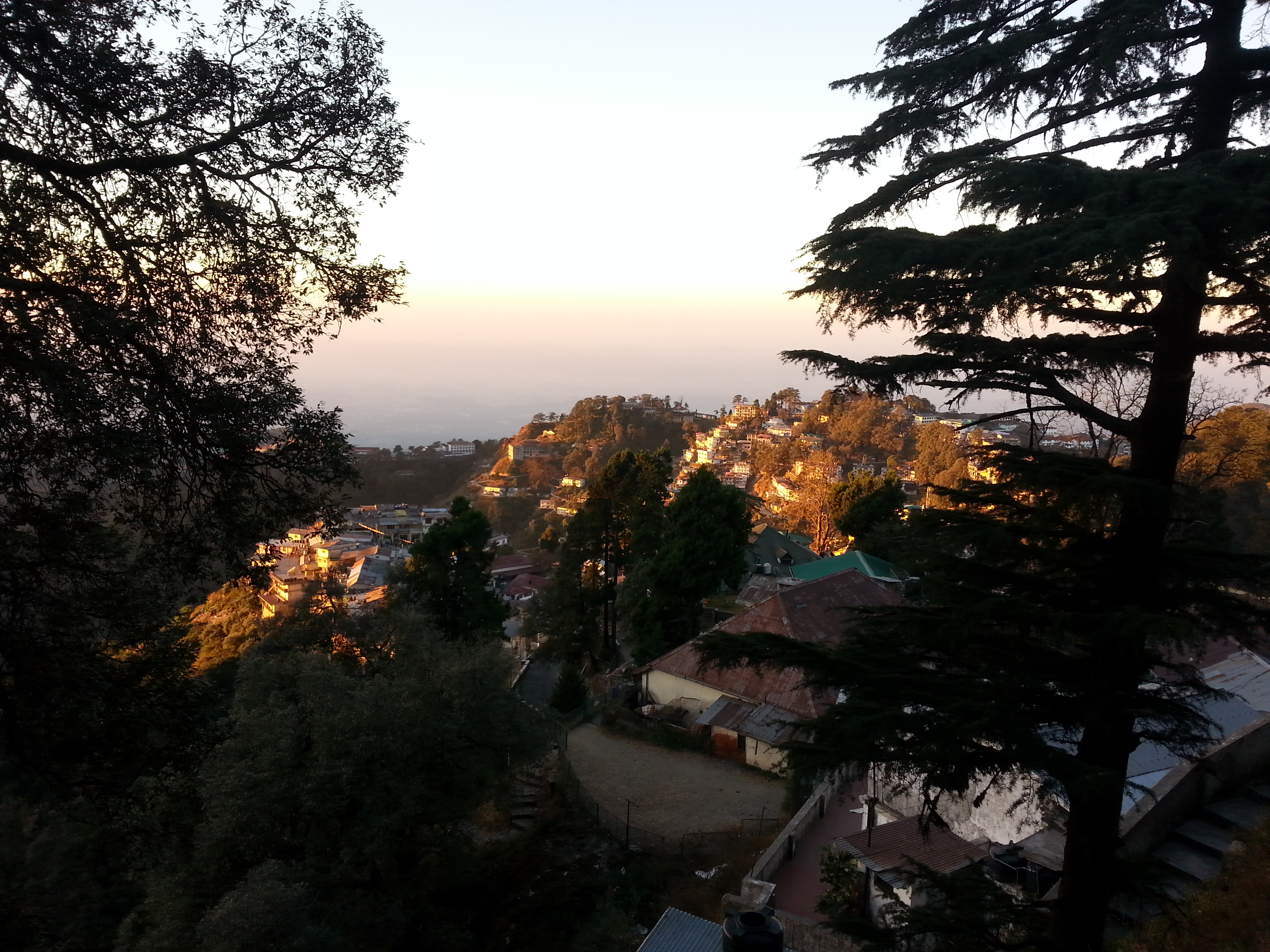 From Dehradund, after a particularly mediocre lunch and too much chicken chow mein (Indian Chinese food is an interesting thing), we boarded a taxi thatdid take us up into the hills, around some hairpin turns with cars rushing towards us and for those more senstive to motion sickness or those trying to sleep or those with an unfortunate headache, it was not a great ride. I nhad fun, though! The sun, by this time, was approaching the horizon. You could see for miles, around sharp peaks, and little towns grew in the hills (these ones deserving to be called mountains much much more than those measly things I saw down in Maharashtra, but also dwarfed by the distant snow-capped Himalayas, visible only occasionally on the drive). And you couldn't see the horizon: the fog or smog or what have you blurred the lines when you looked over the edge, and the flat plains below melted into a greyish smudge. At times it felt like you were looking over the edge of the world, as all that was visible was the steeply declining slopes. The sun eventually kissed the horizon, several degrees above where I was picturing it, right about as we drove in to Mussoorie, our destination.