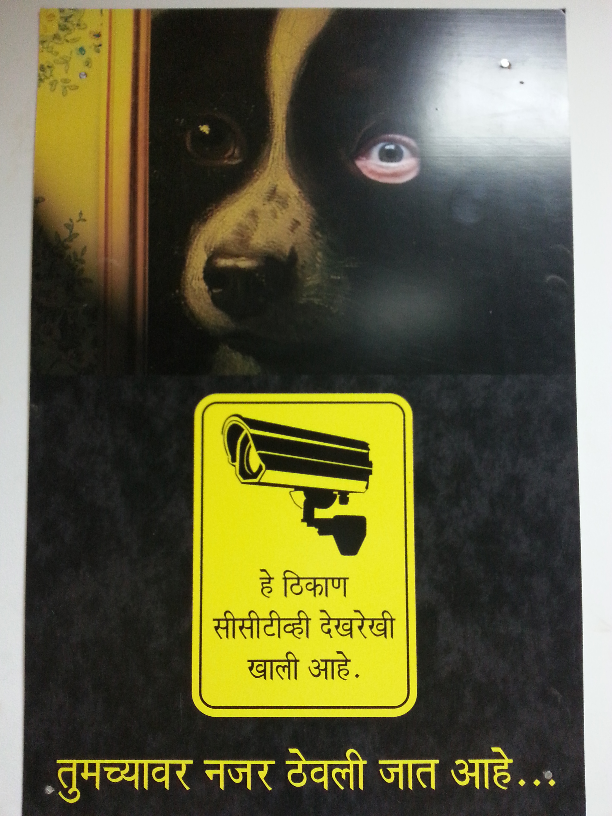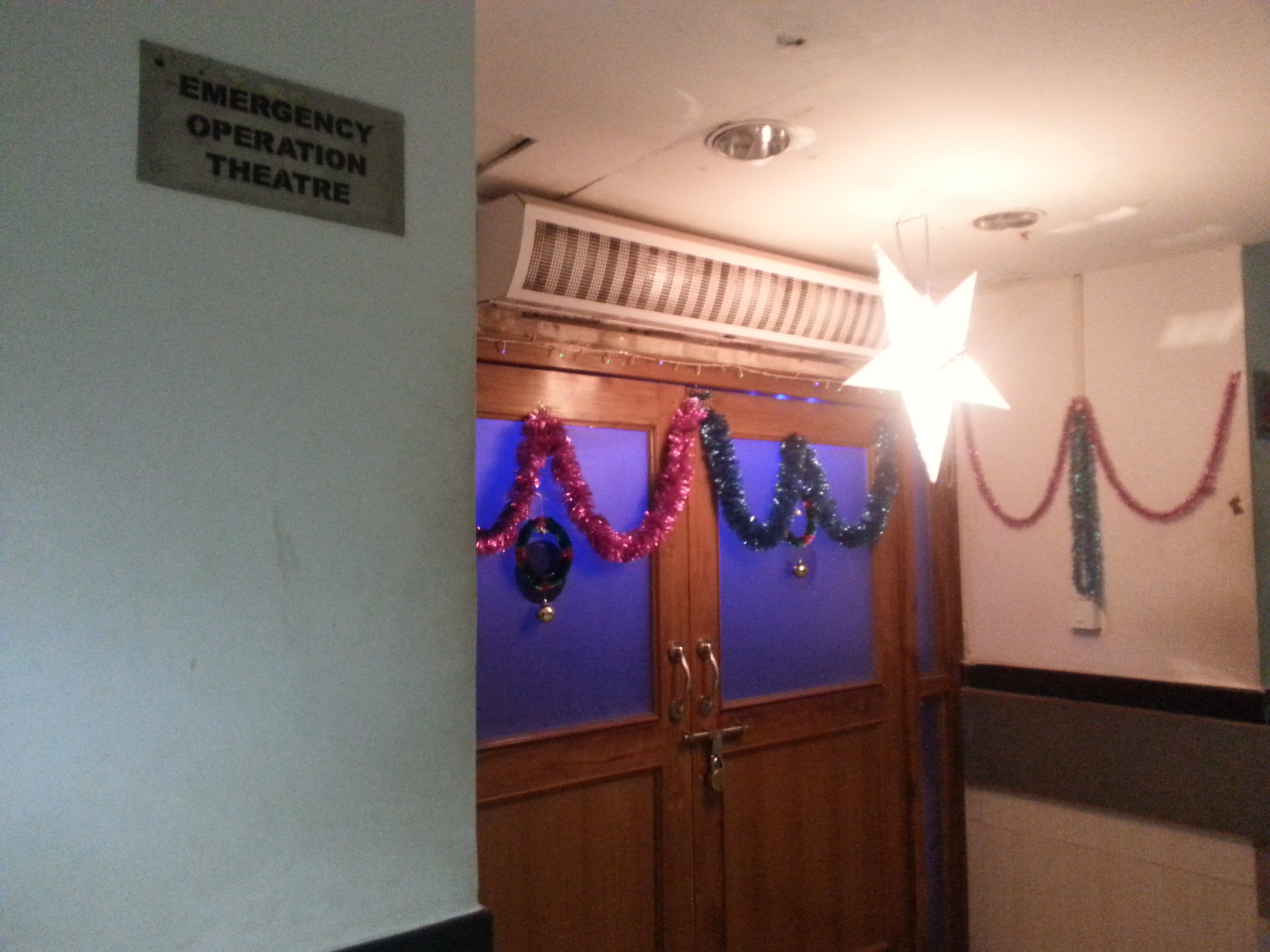 So we drove into the night. I kept nervously looking back to make sure that Ilan (whose headlight had slightly spotty behavior) was still on my tail, anxiously running over what happened and could happen and what were the inevitable outcomes and how Aahlad was doing (probably panicky, I had deliberately not really described what was going on with his wounds because they were rather gross, and then he had been taken away in a police car). Ilan would wave and say “Keep going, keep going” and then I would ask “where to?” and we would continue. We asked a few people where we were going and eventually made it to the hospital, to probably the correct building and we were walking down the halls and everything was incredibly surreal. No one told us where he might be, there were people suffering around every corner. Posters lined the walls, proclaiming that we were being watched in both Hindi and English; the English posters portrayed a single large eye hiding behind a rip in the papers, the Hindi posters, a wide human eye on an otherwise adorable puppy. The emergency operating theater was decked out in tinsel with a large metalic Christmas star hanging in front of the door, while behind the cloudy glass, purple Christmas lights flashed patterns. A mother dog and several very young puppies wandered around one abandoned hallway.