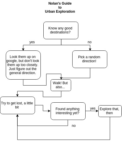 Urban Exploration, to paint in broad strokes, consists of walking. More specifically, Upon the start of the day, I get up at a leisurely pace and then choose some destination for the day. What particular destination this is is not so important though: only a minority of the time will be spent there. I look it up on Google maps, and instead of paying to close attention to the details, figure out the general direction that it is located in. Alternatively: I just choose a direction at random. With my chosen direction on hand, I hit the streets, and this is crucial: I try to get lost. I don't put much effort into it, but I also consult my maps as rarely as possible, navigating by the sun and the moon and basically just trying to find anything interesting. This might include the destination I had planned, it might instead include a back-alley philately museum or strange market or good food or maybe just long stretches of boredom.