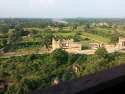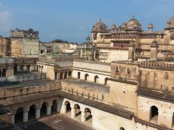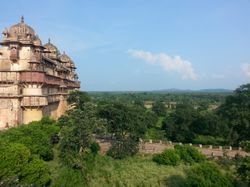 After detraining and riding in a private bus-thing for 45 minutes or so, we arrived in the town of Orccha. It used to be the second capital of some Rajput kingdom that totally started with the letter 'B', and was full of temples and palaces and cenotaphs and about 8 thousand current inhabitants as compared to once-upon-a-time 40 thousand (a number that might very well be terribly inacurate, but anyways it was much bigger in those years is what I gathered). And much of it (volume-wise) is in a fusion of Mughal and classical Indian styles, with hexagons and geometric designs and spires and elephants and lotus flowers all carefully carved in and extremely ornate and intricate. And there is a river running through it that at first glance appears clean! On second and third and so on, this fades, but it is still pretty clean and there were many people happily bathing and swimming around (I was invited by one kid to swim myself, but told him I was just planning on sitting on the bridge and admiring the view, a concept that was somewhat lost on him).