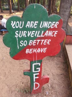 So we drove into the night. I kept nervously looking back to make sure that Ilan (whose headlight had slightly spotty behavior) was still on my tail, anxiously running over what happened and could happen and what were the inevitable outcomes and how Aahlad was doing (probably panicky, I had deliberately not really described what was going on with his wounds because they were rather gross, and then he had been taken away in a police car). Ilan would wave and say “Keep going, keep going” and then I would ask “where to?” and we would continue. We asked a few people where we were going and eventually made it to the hospital, to probably the correct building and we were walking down the halls and everything was incredibly surreal. No one told us where he might be, there were people suffering around every corner. Posters lined the walls, proclaiming that we were being watched in both Hindi and English; the English posters portrayed a single large eye hiding behind a rip in the papers, the Hindi posters, a wide human eye on an otherwise adorable puppy. The emergency operating theater was decked out in tinsel with a large metalic Christmas star hanging in front of the door, while behind the cloudy glass, purple Christmas lights flashed patterns. A mother dog and several very young puppies wandered around one abandoned hallway.